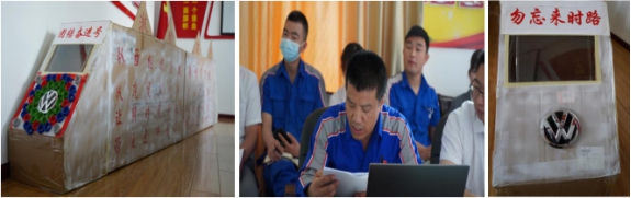 西柏坡精神是部生動的教科書,車間工人黨員袁有德利用平時裝配件的紙盒子,創(chuàng)意性地制做了一列"團結奮進號"火車,邀請黨員一起乘車前行。袁有德說:"團結奮進號"列車蘊含著學習西柏坡精神,強企富家、團結奮進的寓意,車頭前面的"大眾"標識代表公司經營的品牌;八個綠色的大美孚機油蓋代表八方來財,所有蓋口都向外代表招攬客戶,減少流失,而且像螺絲釘一樣牢牢釘?。≤囶^車尾標有"勿忘來時路"的字樣,以此提醒廣大黨員干部不忘初心、牢記使命,一定不要忘記來時的路,回顧過去,展望未來,讓"團結奮進"號列車在西柏坡精神的感召下前行。支部要求,在疫情防控和汽車行車嚴竣的形勢下,我們每一個物產汽貿員工都是新時代的答卷者,讓"團結奮進號"奔馳在新時代的征程上,承載著中國夢、物產夢,承載著物產汽貿職工群眾對美好生活的向往,風馳電掣,勇往直前,奔向未來!