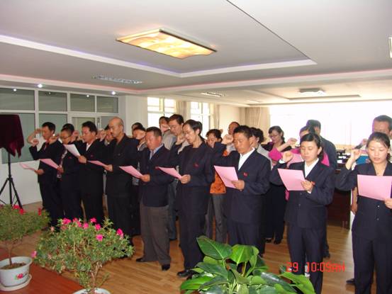 我宣誓:"我志愿加入中國(guó)共產(chǎn)黨,擁護(hù)黨的綱領(lǐng),遵守黨的章程,履行黨員義務(wù),執(zhí)行黨的決定,嚴(yán)守黨的紀(jì)律,保守黨的秘密,對(duì)黨忠誠(chéng),積極工作,為共產(chǎn)主義奮斗終身,隨時(shí)準(zhǔn)備為黨和人民犧牲一切,永不叛黨"。6月29日上午10∶00時(shí),17名新加入黨組織的中國(guó)共產(chǎn)黨預(yù)備黨員、所屬各黨組織書(shū)記、老黨員代表等30余人的莊嚴(yán)宣誓,標(biāo)志著青海物產(chǎn)系統(tǒng)慶祝建黨91周年系列活動(dòng)正式展開(kāi)。